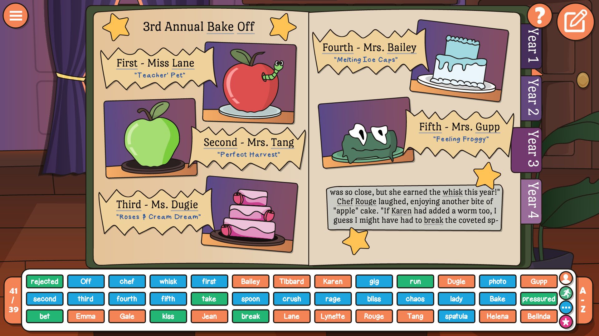 When you hit the “Solve” button, it takes you to the other half of the game, where you use the words from the word bank to fill in Mad Libs-style fill-in-the-blanks puzzles. Most scenes have three puzzles: one where you identify the names of the characters, one where you identify items that belong to different people (such as whose locker is whose in a high school), and one where you complete sentences explaining the entire scene. If you need help, a series of text-based hints are available that point you to things you might have missed in the scene.