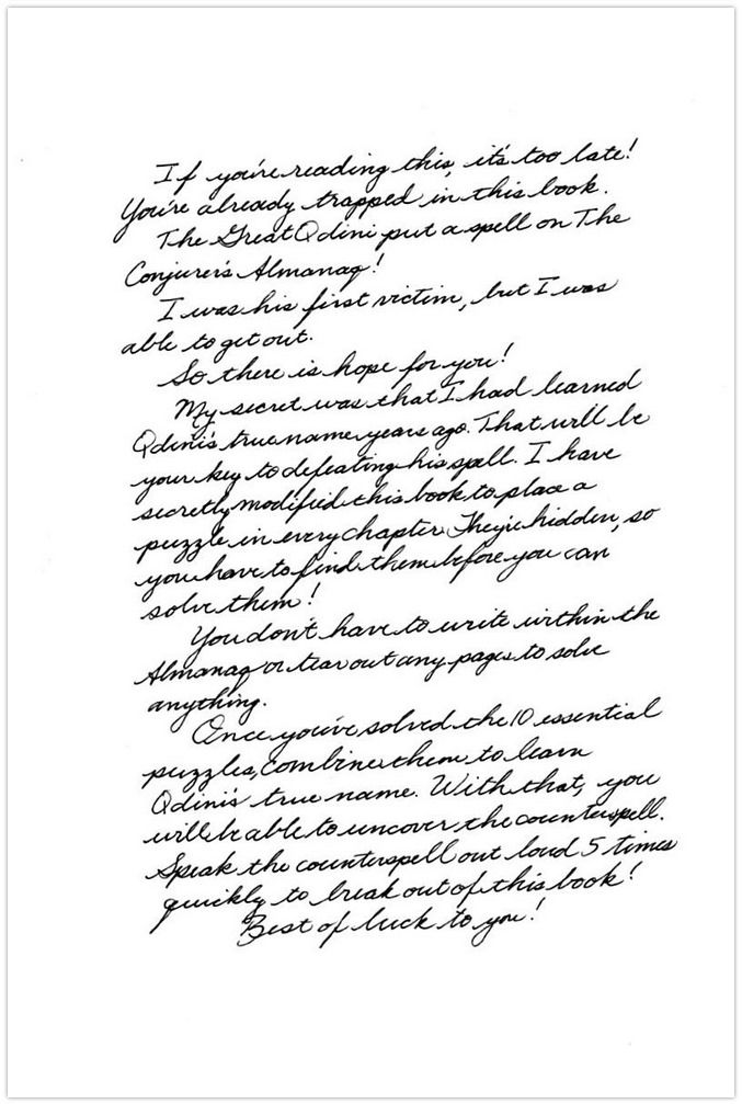 The Conjurer’s Almanaq is the ultimate guide to the conjuring arts. Or is it? Start reading and you'll be trapped inside! This unique puzzle book is an escape room in a book, only there is no room. You're trapped in the book itself by an evil spell cast by The Great Qdini. Find the hidden puzzles and learn Qdini's true name to make your way out.