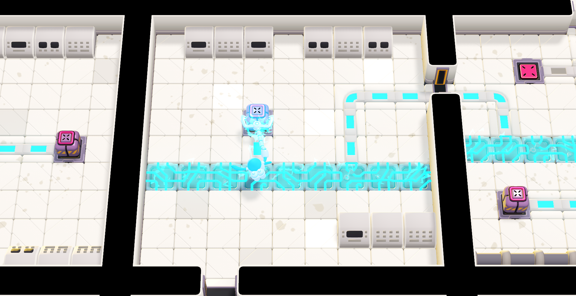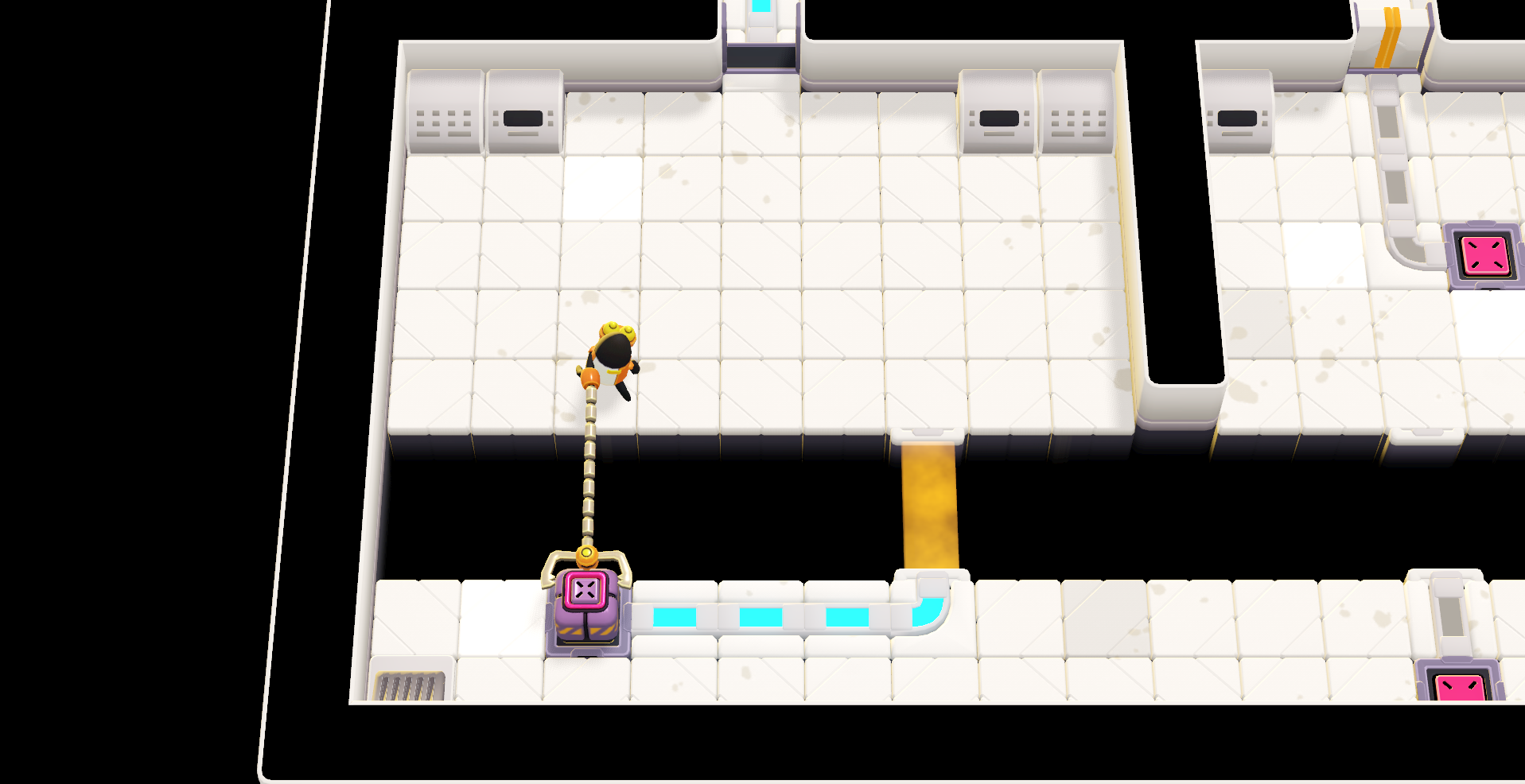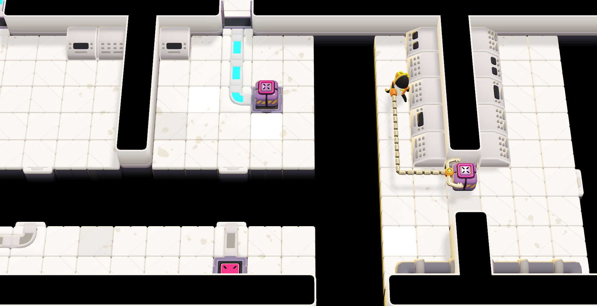 In this expedition, the monster comes equipped with a grabber arm that lets them safely manipulate cubes from a distance. This grabber-arm can be used in surprising ways, and can especially be bent around corners, which adds originality and complexity to the otherwise more classic mechanics you encounter. Cubes can be used to activate pressure plates and open doors, but they also conduct electricity. This can be harmful for the monster if they walk too close, however this also allows for the creation of electrical circuits that can power certain doors.