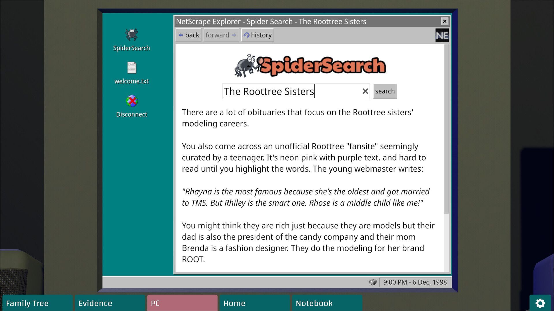 The Roottrees are Dead is a deduction-based detective game about filling in an intricate family tree. A celebrity family has died, and you must search a mock version of the late-90s internet to figure out who is entitled to receive part of the inheritance. The original Itch.io version of the game was a breakout hit in Global Game Jam 2023, and the Steam release has received wide praise for its unique format and challenging deductions.