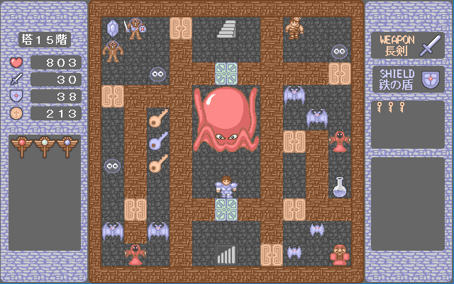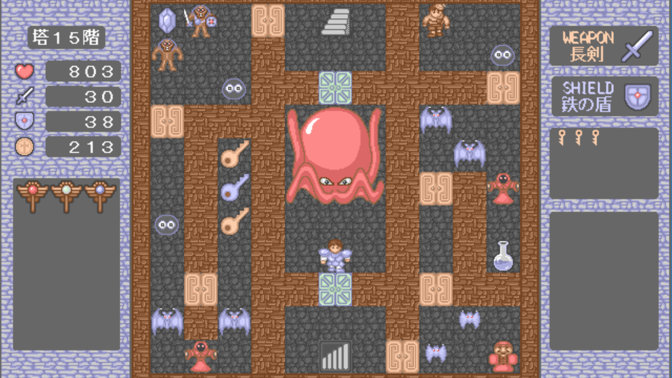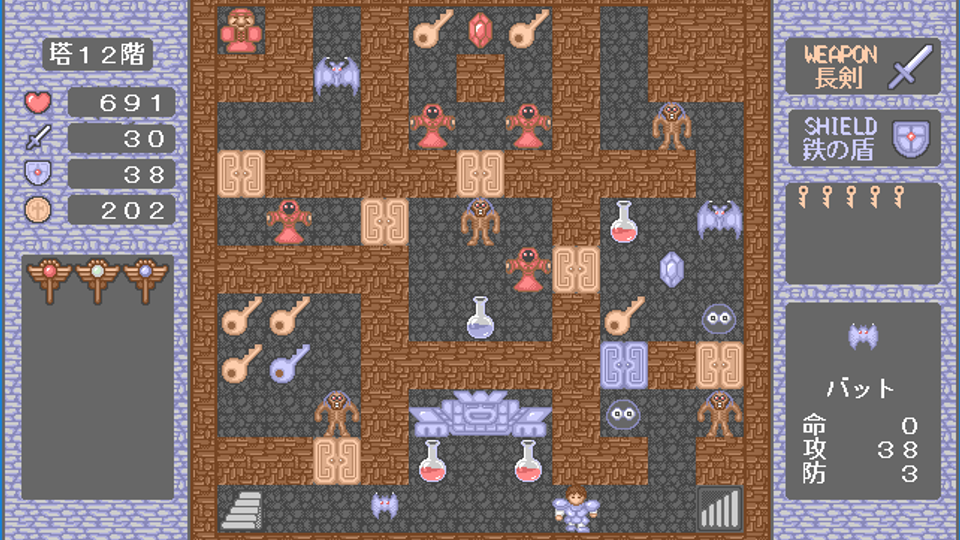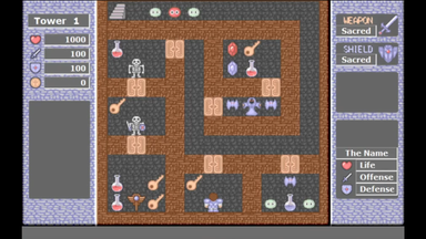 Tower of the Sorcerer (a.k.a. Magic Tower as an alternative translation) is a puzzle-strategy game about a hero climbing up a tower in order to save a princess. This may sound like a role-playing adventure, except the items and enemies have fixed positions within the dungeon and the outcome of each fight is entirely deterministic; this shapes the gameplay towards thoughtful resource management and complex route planning. Tower of the Sorcerer enjoyed significant popularity in China, where a large community of players has created countless dungeons based on the game's assets and mechanics.