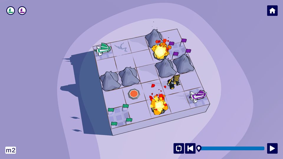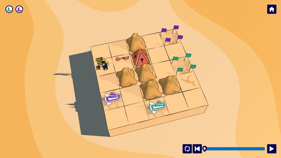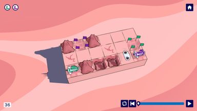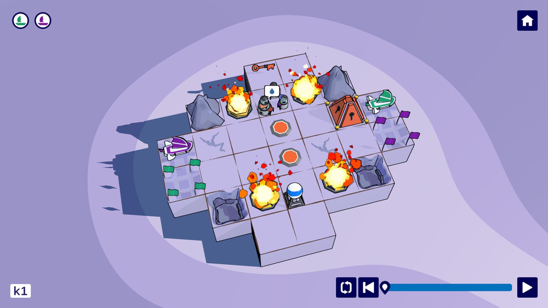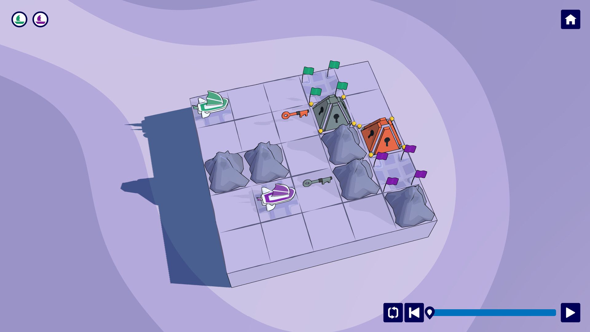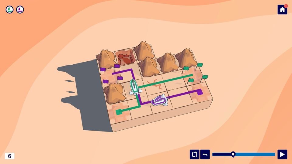The ships start at fixed positions on a grid-based map; they must be guided to specific finish tiles by drawing color-coded paths. Ships cannot visit the same tile twice (i.e. they cannot cross their own path), however the paths from two ships may overlap, as long as they don’t visit the same tile at the same moment. Once you’ve drawn the appropriate lines, you hit play to watch the ships follow their paths in parallel, one tile at a time. If they’re able to make it to their respective ends without any untimely, disastrous crossing, then the puzzle is cleared!