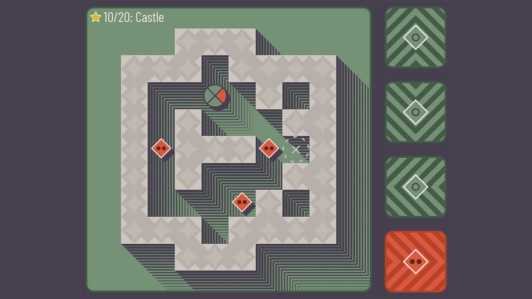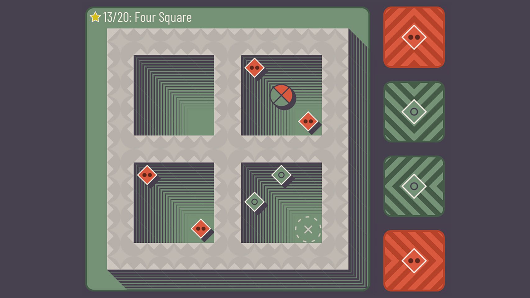 You’ll start out with a blank circle which can move up, down, left and right. The circle has four empty sections which correlate to each direction. The grid also contains several diamond pieces, which can be slotted in the circle for either one of the directions. When a piece is slotted, it alters the number of spaces you move on every input for the corresponding direction. For instance, you may end up navigating the level with a 2-space jump every time you want to go right.