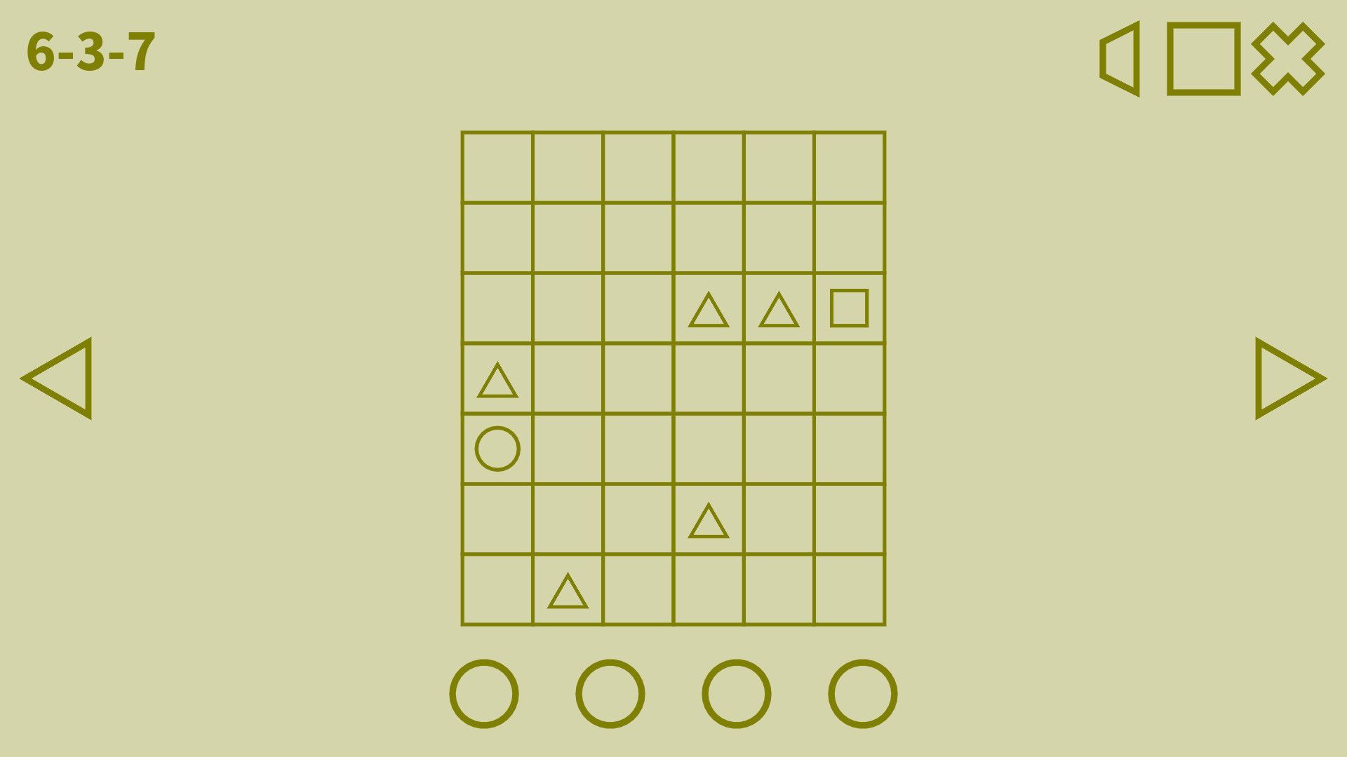 Each level is a small grid that contains a number of geometric shapes. Within a given set of levels, each shape is bound to one undisclosed line-drawing rule. For instance, you might have to start your line on a circle, end it on a square, and avoid all triangles in between. The puzzle is not so much about applying the rules as it is about pinpointing them through trial and error, drawing multiples lines to test your conjectures.