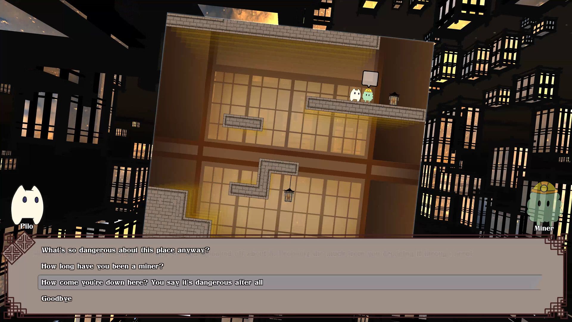 In Vextorial, you play as Pilo, a cute creature searching for their missing brother. Pilo has the space-bending power to switch between 2D and 3D, allowing them to traverse space in perplexing ways. In 2D mode, Pilo can only move around within a single plane, but can rotate the world (and gravity with it) by touching one of the plane's edges. Switching to 3D mode reveals that this plane is actually just one face on the inside of a cube and that the edges are passageways from one face to the next.