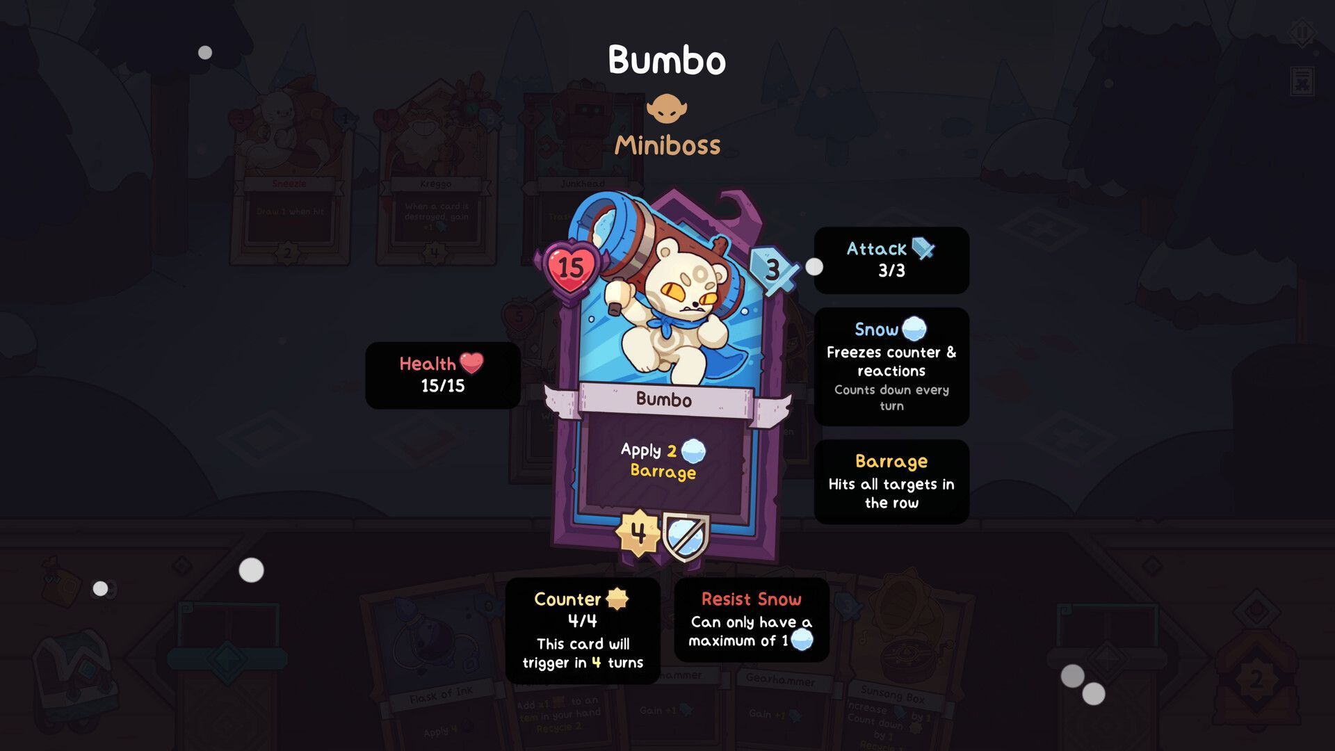 Plan ahead with the help of a dynamic counter system to map out your next move and fend off frosty foes. While Wildfrost battles are turn-based, cards don’t attack every turn. Instead they have a ‘counter’ which counts down the amount of turns until they’re ready to automatically make their move!