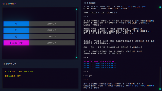 Acquiring knowledge about a language in an adventure game usually facilitates exploration and helps advancing the story. Popular games such as Chants of Sennaar and Heaven’s Vault include elaborate constructed languages with cohesive grammar, vocabulary, and fictional writing systems. Players add presumed translations into their word bank, and they receive confirmation once they’ve made enough correct guesses.