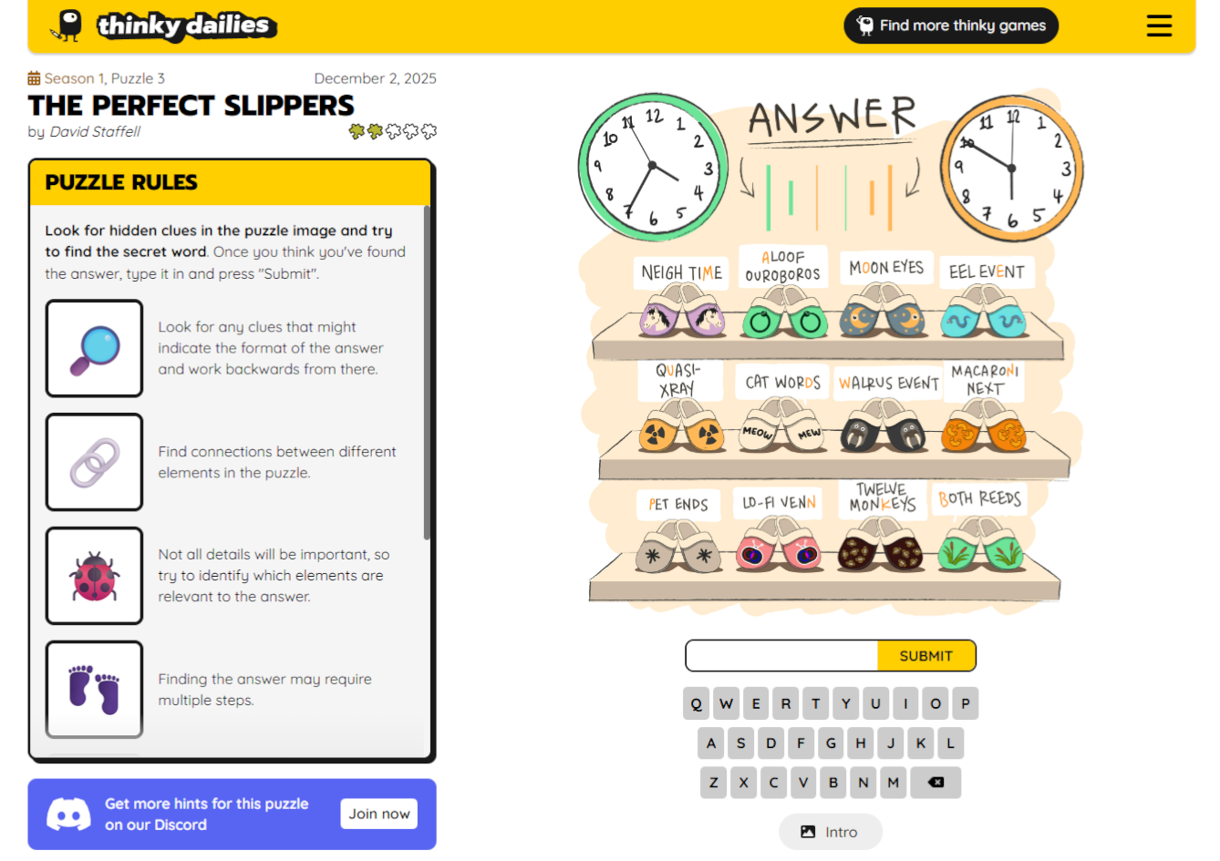 We know that you've seen daily puzzle games before, but we're trying something different: rather than go the common Wordle route and ask you to solve the same kind of puzzle day after day, we've commissioned some very talented puzzle designers to create a lineup of puzzles where each is unique: every day is a new kind of puzzle. Visual riddles, language puzzles, logic grids... we've got it all.