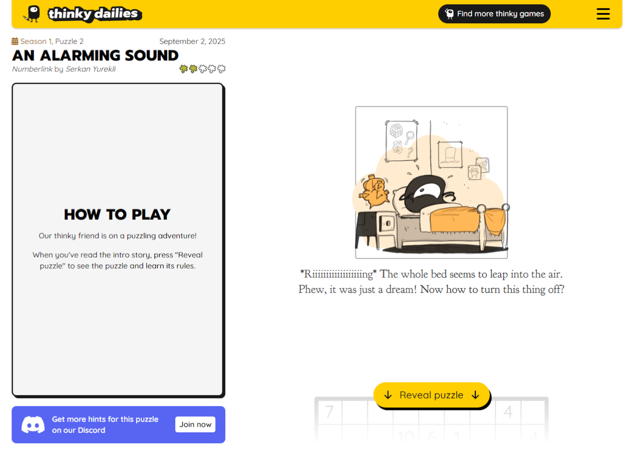 We've had this in the works a long time, and it's very exciting to finally be able to share: Thinky Dailies are our very own daily puzzles that will premiere on the site once a day, featuring charming illustrations, a big variety of puzzle types for all skill levels, and are all playable on mobile or desktop browser. (And of course, it's all totally free.)