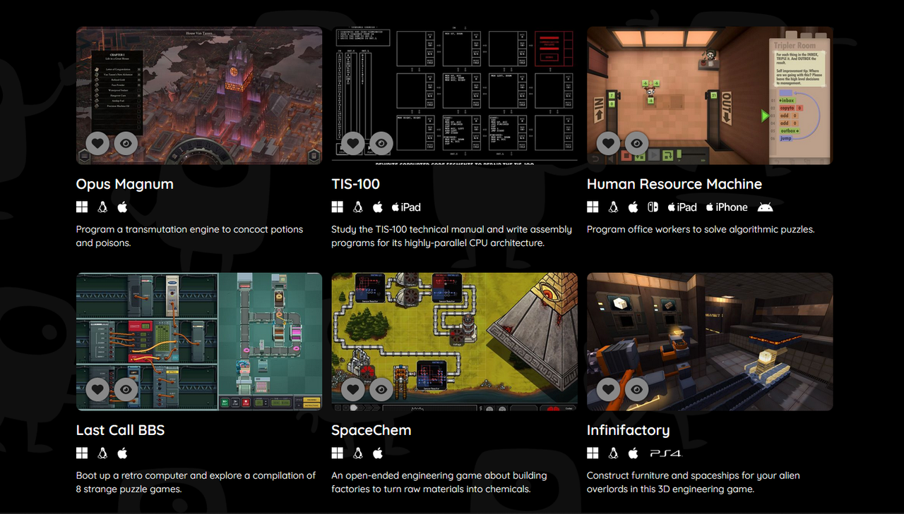 You can browse these new categories and lists of games by visiting our genre pages such as engineering games, automation games, programming games and zachlikes. That last one of these many interconnected sub-genres is a name that comes from the studio Zachtronics (you can also browse our database by developer) who have created and published many fan-favorite games in this realm (Opus Magnum and Last Call BBS to name a few), and became a sort of de-facto identifier for other games that play in similar ways.