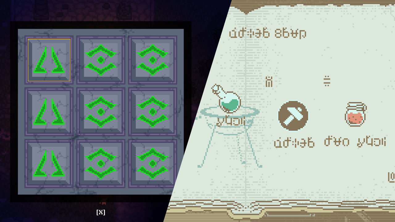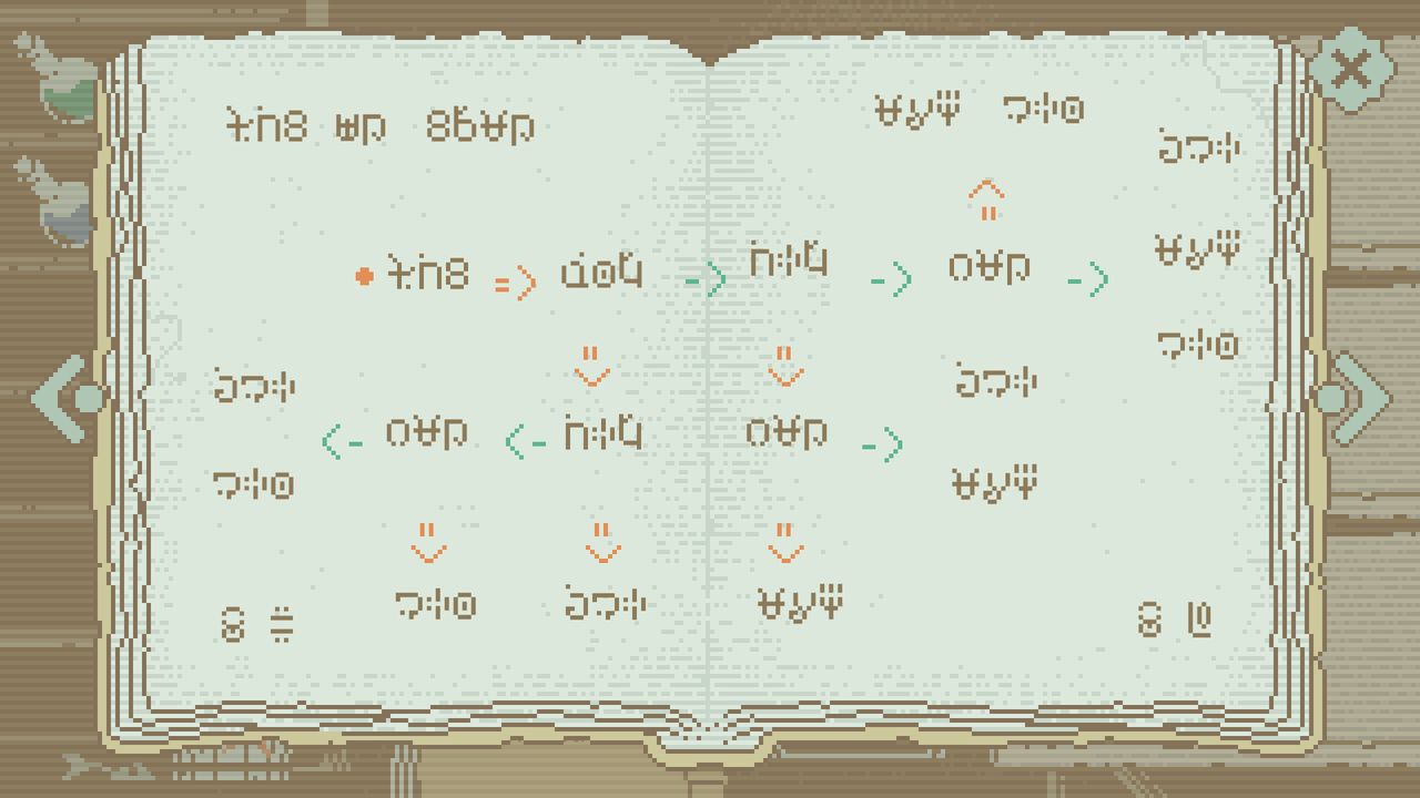 First up, The Apothecary of Trubiz deals very directly with deciphering a text you start out with no knowledge of: you're showing up to your first day as the new apothecary (potion brewer) in town, but for reasons I'm not entirely sure of, all the tomes and manuals in the potion shop are written in a completely alien alphabet. Perhaps you came from a land very far away and the people here speak a different language: whatever the cause, it's pretty much a nightmare scenario for being a pharmacist and giving out medicine.