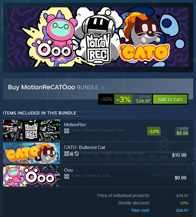 I sometimes find the discount tags on Steam bundles to be a bit confusing, so after some investigating, my short explanation is: Motion Rec has a 10% launch discount, and the triple-game bundle takes off an additional 10% from everything on top of that.