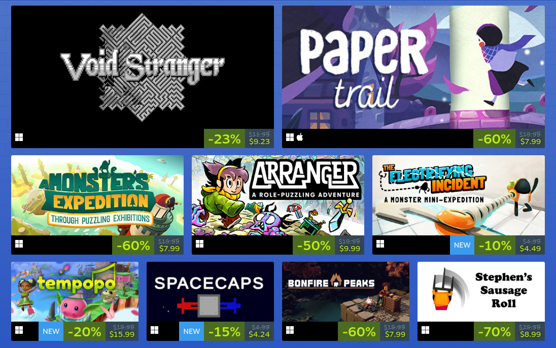 There are plenty of well-loved boxy favorites discounted during the sale, such as Patrick's Parabox, A Monster's Expedition, Void Stranger, Stephen's Sausage Roll, Isles of Sea & Sky and Bonfire Peaks.
