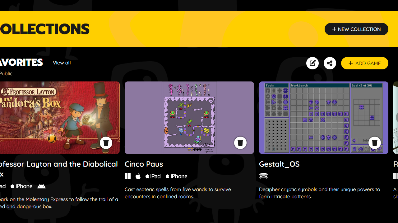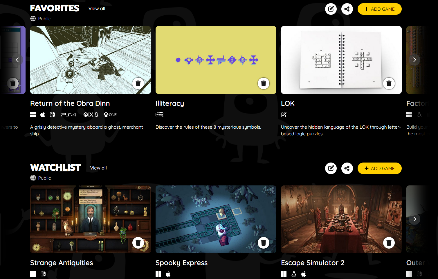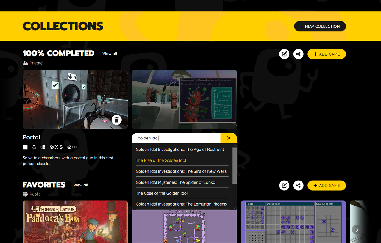 If you don't yet have a Thinky Games account, you can sign up right here on the website using Google or Email or any of the standard options. (Clicking a Sign in button will create an account.) Once logged in, you can view your little profile page to start adding to the default Favorites and Watchlist collections, or you can make a new collection and use the easy search interface inside the collections page to add any game from the database.