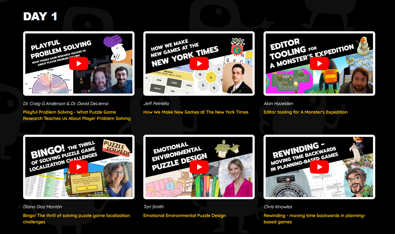 Join us on our YouTube channel or our official Discord server starting on Wednesday, November 5th to watch 3 days worth of talks from people working in the industry of puzzle-adjacent games, whether they're solo developers expounding their game design principles, experts discussing the production and marketing of thinky games, or anyone in between who's knowledgeable and passionate about some relevant part of the process.
