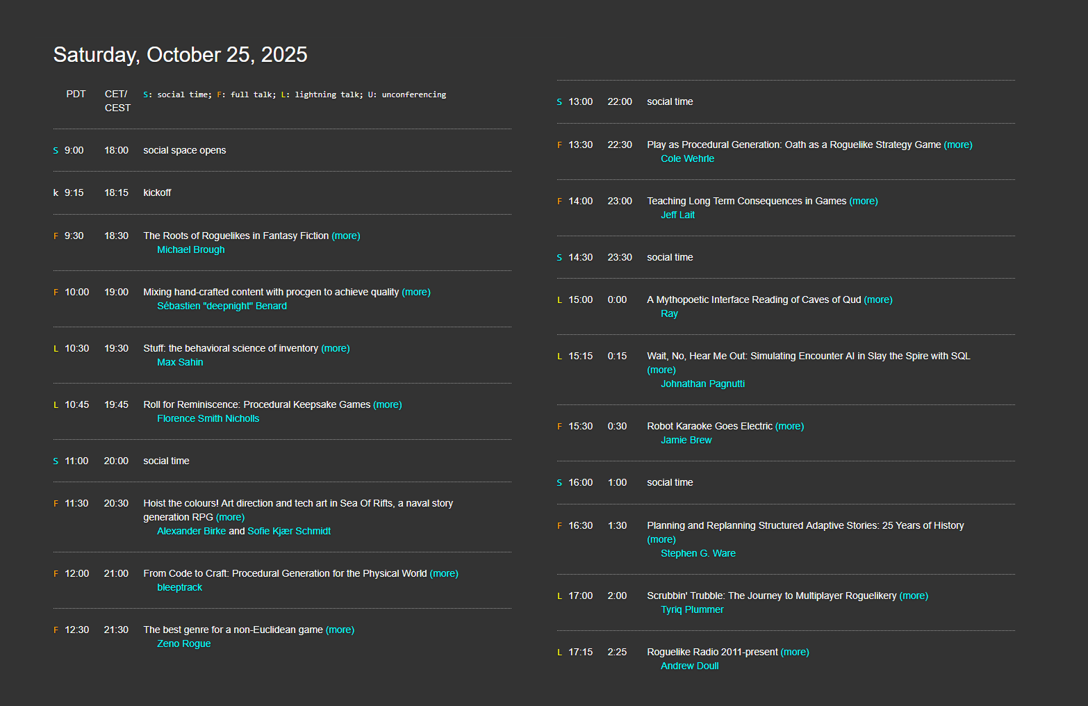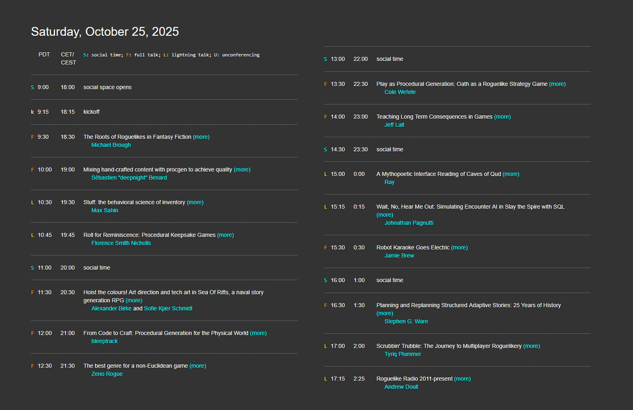 I'm particularly excited to hear Michael Brough's opening talk about the fantasy roots of the genre, and it's fun to recognize some speakers like Zeno Rogue from our own thinky community. (As a big boardgames guy it was also a lovely surprise to see that Cole Wehrle is participating, designer of such popular games as Root, Arcs, and John Company.)