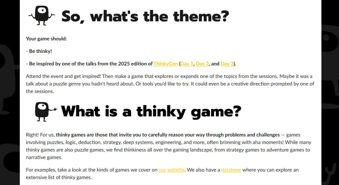 The game jam runs until November 16th, so just over 7 days from the time this article is going up. We don't at all expect people to work on their games that whole time: whatever free moments you get during the week is totally fine. We hope you'll join up and can't wait to see how people have been inspired by ThinkyCon. (If you need some help or advice about making a game for the first time, joining our Discord is a great way to get some friendly answers.)