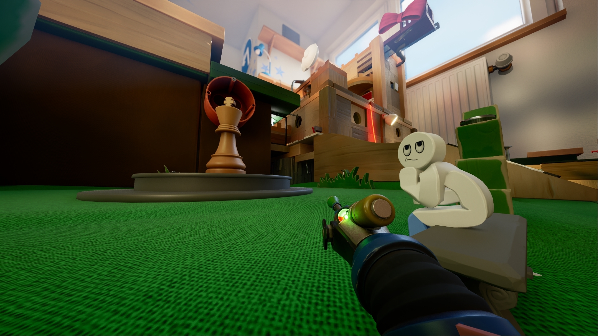 Others range from unhelpful to downright untrue. Take the assertion that “pointless decoration is not really a thing in this world.” This is a confident statement about intentionality—I just don’t know what to do with it. I don’t doubt that everything serves some function, but many objects simply serve as boundaries, structural elements, and, yes, decorations, which have nothing to do with solving puzzles. Another note, that “most people have helpful things to say,” just doesn’t bear out. Most NPCs placed near a puzzle say something to the effect of, “There’s a puzzle here.” Many only exist to engage in a style of humor that I describe as funny, I guess: statements are made in the shape of jokes, often at the player character’s expense, but lack substance. A meeple protesting in front of a candy factory says, “Down with sugar! It makes me fat!” And the meeple is… fat! Is that helpful? Is it even a joke?